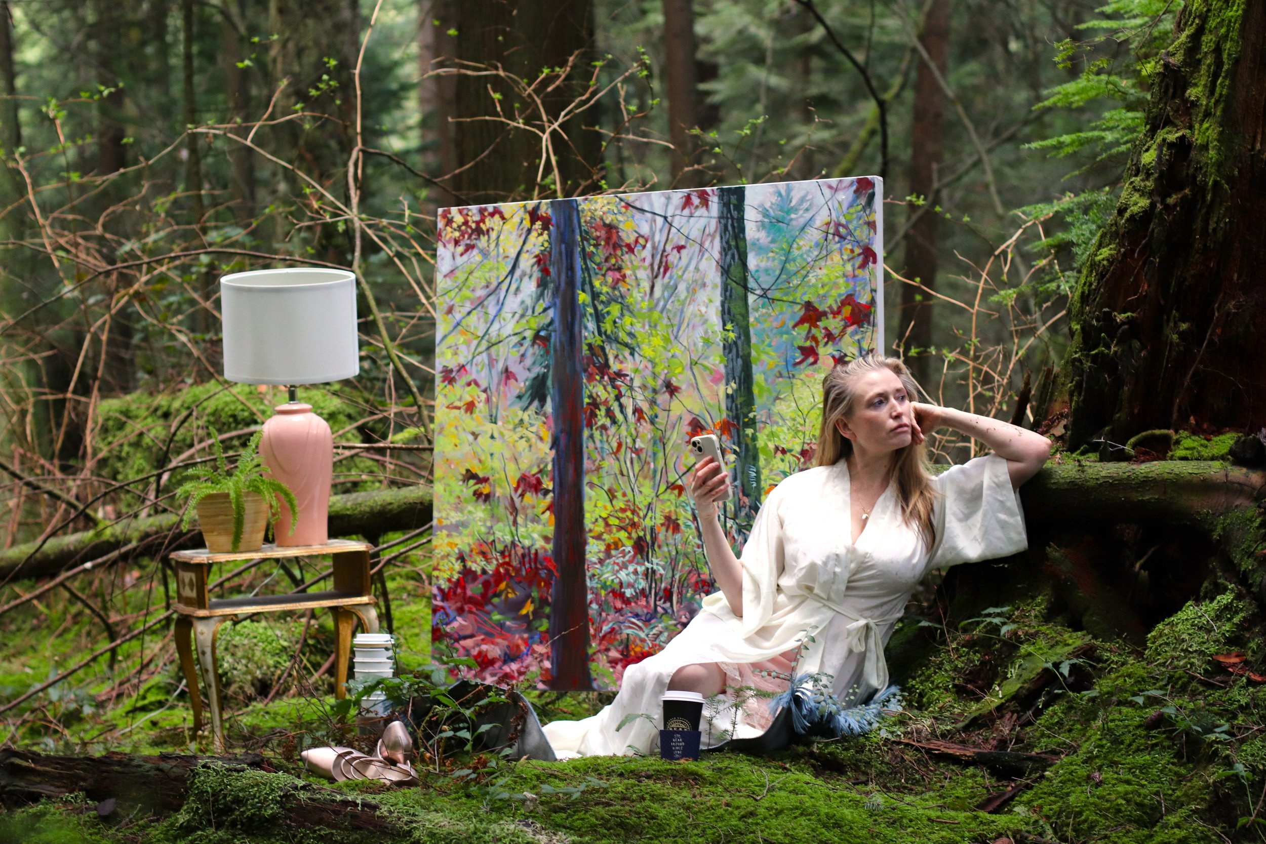 The Forest Gallery collection is an ongoing investigation into the conflict between landscape art and the environmental cost of the work itself, and the place that nature occupies within our modern culture. Oil painting has an impact (materials, solvents, shipping, etc.) that is difficult to ignore. Our society both reveres art depicting our natural spaces and continues to close its eyes to the relentless growth of our capitalist system that exploits and destroys nature. Humans no longer seem to recognise that they are in fact animals with an ecological niche that they have been ignoring to their own peril. I put my paintings back into the disappearing forest that inspired them in order to invite the viewer to share in this troubling clash of ideas.